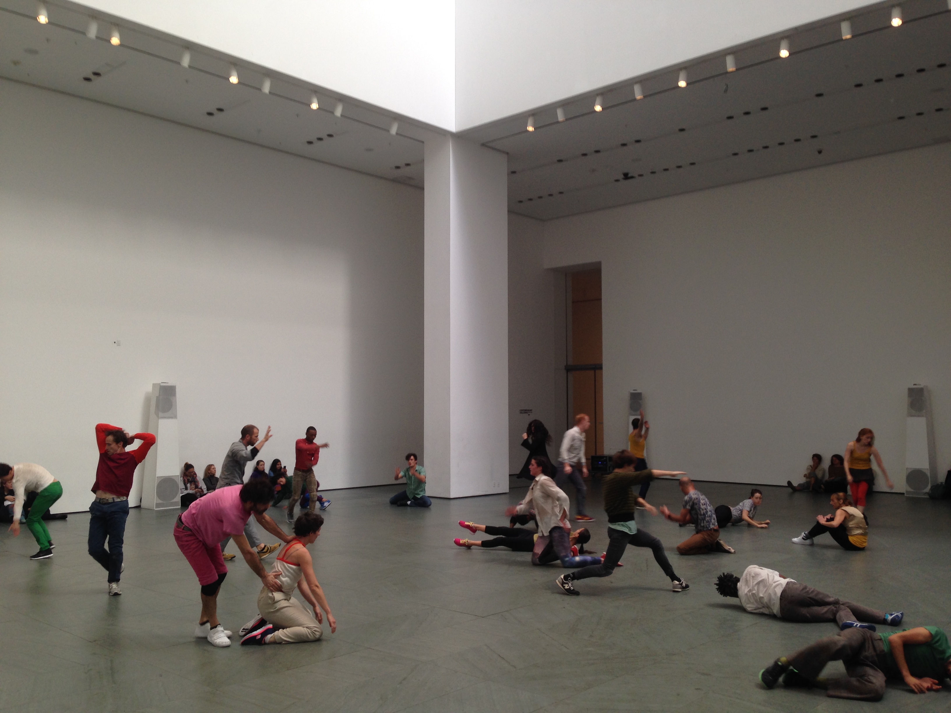 In the second installment of the three-week project Musée de la danse – Three Collective Gestures, French choreographer and Musée curator Boris Charmatz and his cast of 24 dancers took over the second floor atrium at the Museum of Modern Art this weekend to present Charmatz’s Levée des conflits extended/Suspension of Conflicts Extended. A “durational piece,” Levée was performed for five hours straight, but could probably go on infinitely. The premise is simple – the dancers perform 25 pre-determined gestures, and since there are only 24 dancers, at least one movement is undanced at any given moment.