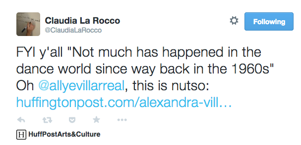 Out of the hundreds of tweets that flood my Twitter feed daily, I was lucky enough last Wednesday afternoon to catch a 140-character dance battle developing before my eyes. The exchange, between venerable New York City-based dance critic Claudia La Rocco, student blogger Alexandra Villarreal, and eventually, Katherine Brooks, Senior Arts & Culture Editor of The Huffington Post, centered around journalistic quality in the dance field, a topic for which La Rocco happens to be a particularly well-known advocate.