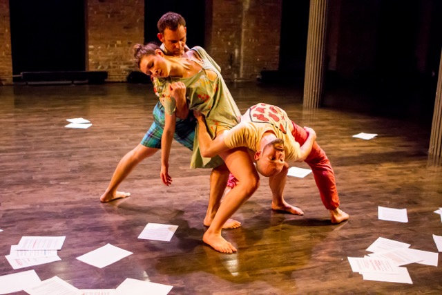 Perhaps these repetitive moments are Flomin’s metaphor for dance itself: it has always been and will always be, passing through history one body at a time. Once this dance, or any dance, has become a part of you, it will never truly leave. Flomin’s questionnaire data poignantly supports this claim, and his decision to include the responses visually, textually, and aurally in the performance suggests that the physical and emotional memories left by dance are inescapable. Printed on plain white paper, the responses were arranged multiple times around the stage; occasionally, a dancer would read a sentence or two, perhaps about someone’s earliest memory of dancing (holding hands and skipping in a circle and feeling quite proud of the physical feat), or a snippet of advice (“Don’t comment on the movement.”). At one point, we hear, “The best years are when you’re young.” Shortly afterwards, Button (the youngest of the cast) dances an exhausting solo that has her running repeatedly to a downstage corner filled with papers, where she descends, catches herself, then gets up to run again. Even when she is drenched with sweat and heaving for breath, she soldiers on for one more pass.