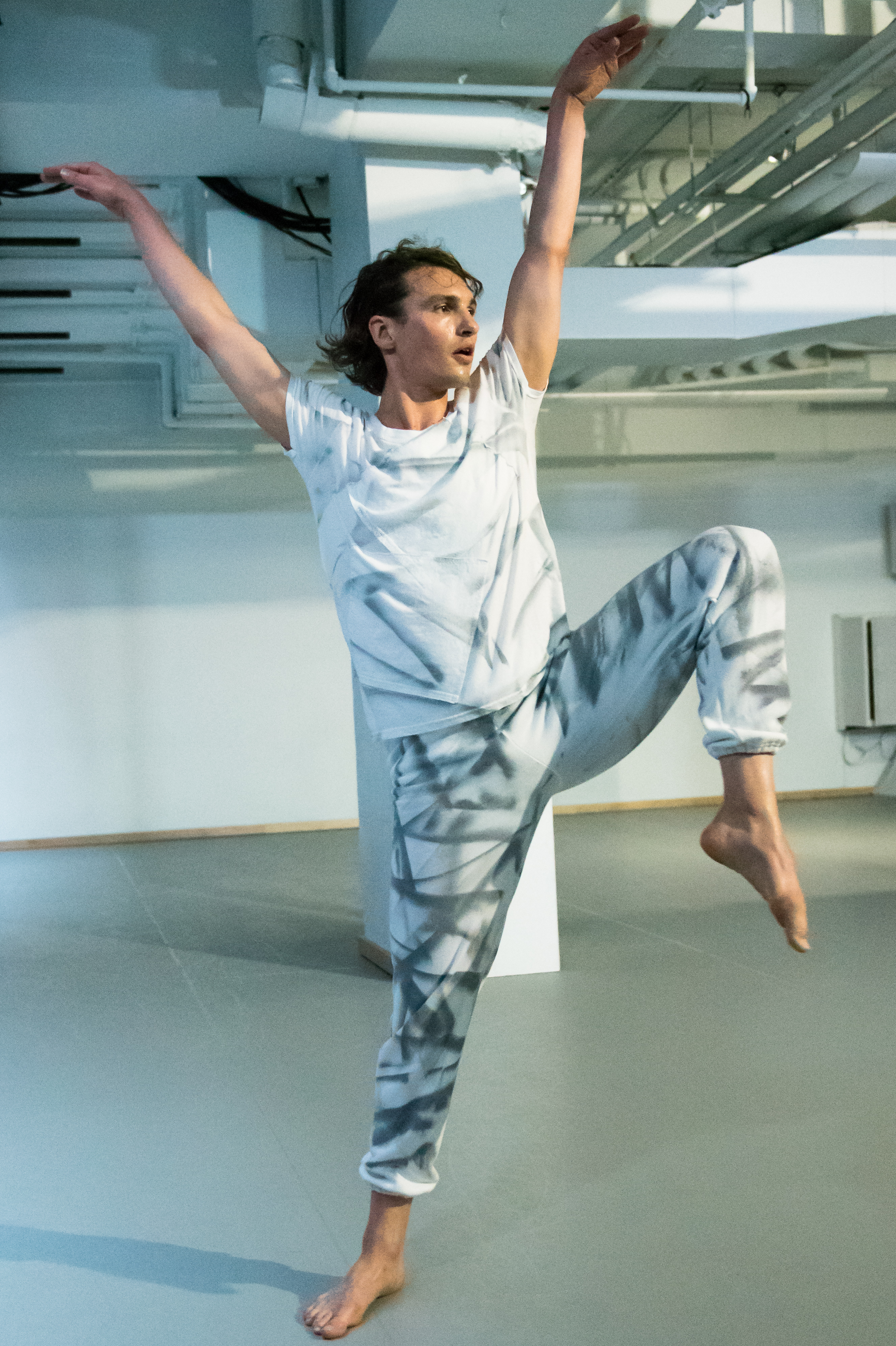 The natural light is fading fast, and colored stage lights start to infiltrate the space. An architectural support beam, which often impedes the audience’s total view of the dance, is suddenly lit like a monolith, a pillar of light in a darkening sky. Soon, Ingle uses this “natural” feature to support his extended handstand balance, and the room starts to dance. When curtains are drawn back to reveal the usual studio mirrors, the area doubles to suggest a vast, open landscape. Here, indeed, is space-in-the-making, a fluctuation between the exploration of normal bodies in a room and the desire to imitate the grander perfection of Nature with a capital “N”.